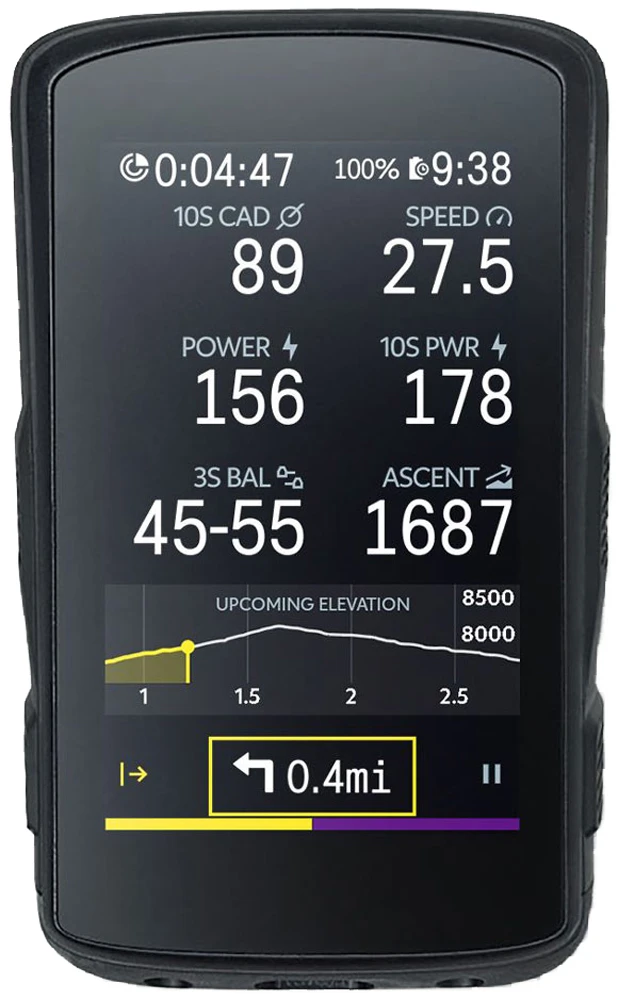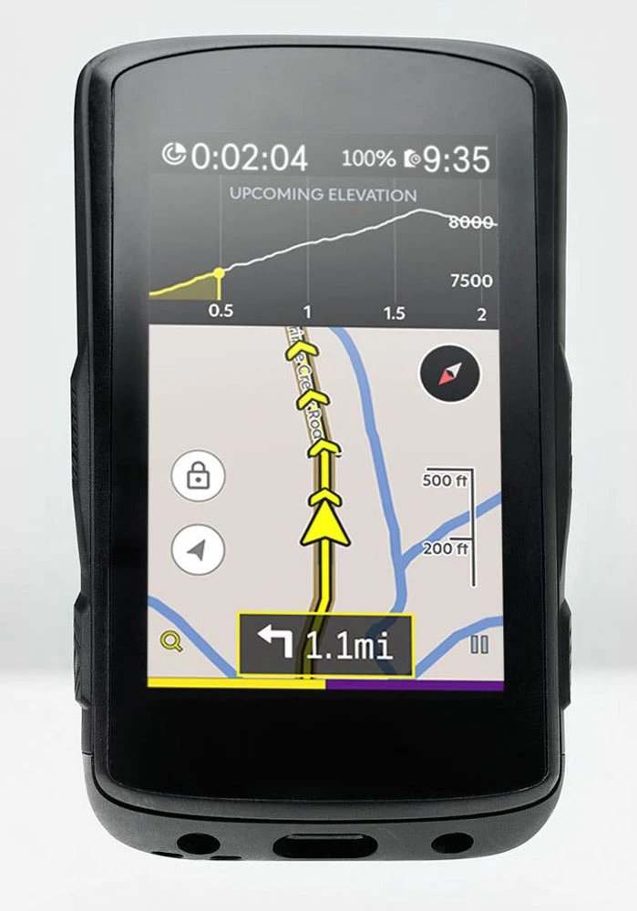 - Normes de capteurs prises en charge : Bluetooth (par ex. capteur de fréquence cardiaque/poitrine et/ou capteur de cadence en option, non inclus), ANT+, Smart Trainer, Campagnolo EPS, Varia Radar, Shimano Di2, SRAM eTap